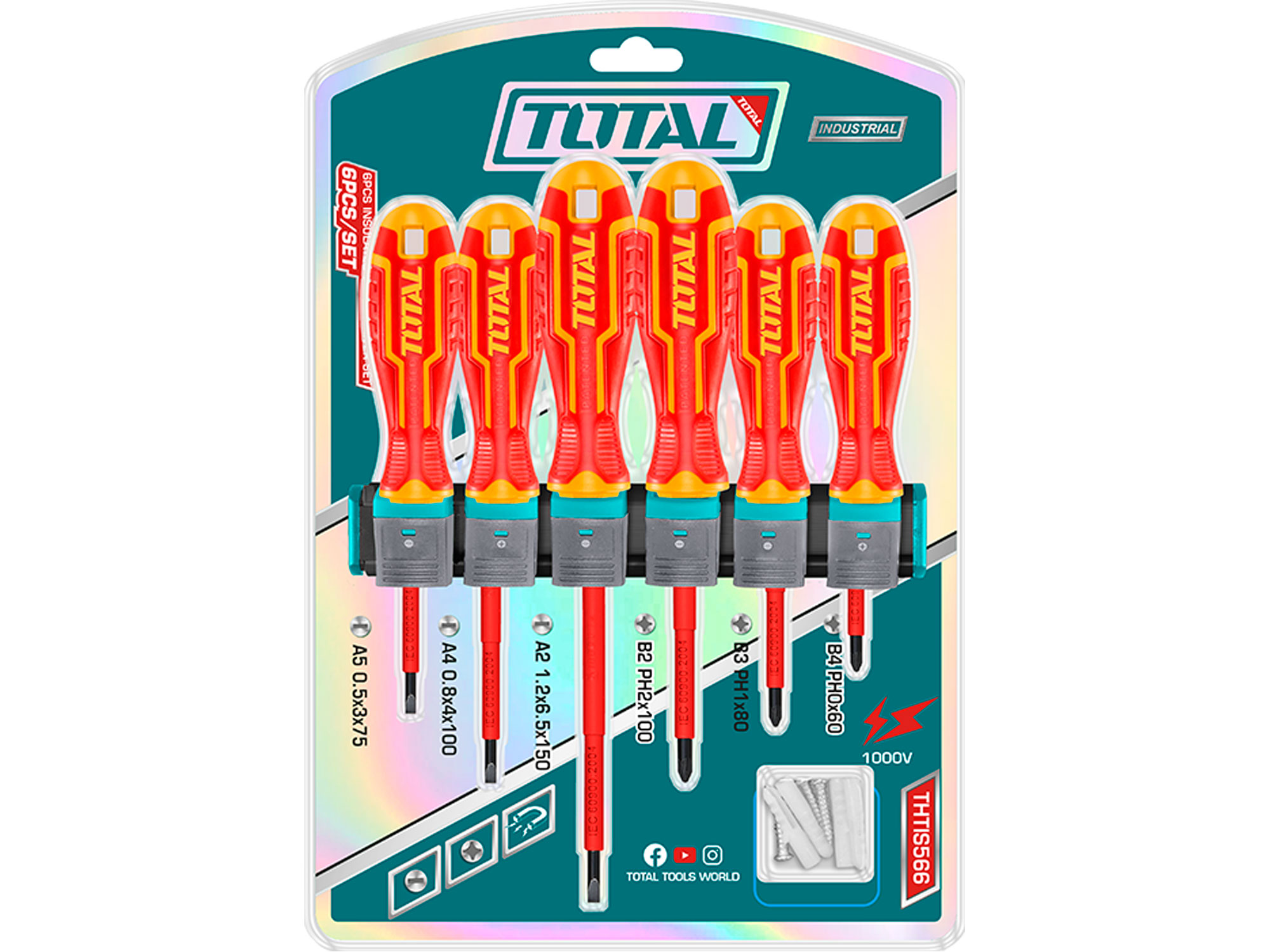 Dieses 6er-Set Schraubendreher ist speziell für den industriellen Gebrauch konzipiert und entspricht den VDE-Normen für Elektrogeräte bis zu 1000 Volt. Das Set beinhaltet sechs verschiedene Schraubendreher, darunter Schlitzschraubendreher mit den Größen (-)3×75, (-)4×100, (-)6,5×150 und Kreuzschlitzschraubendreher PH0×60, PH1×80, PH2×100.