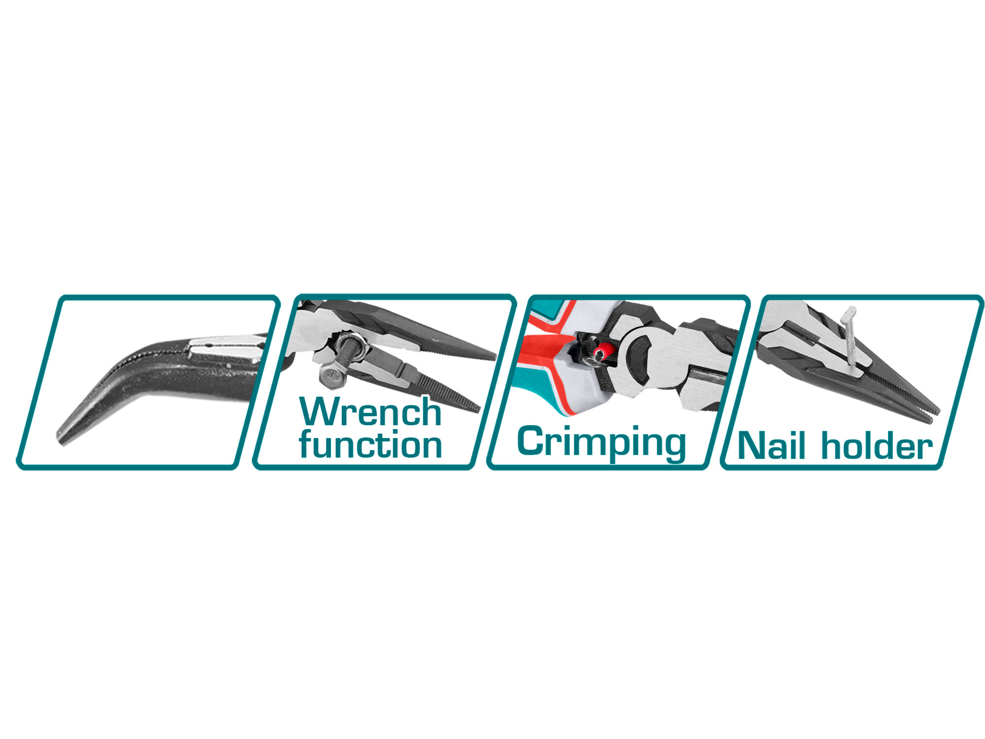 Zusätzlich zu ihren Standardfunktionen bietet die Total Gebogene Halbrundzange auch eine Crimpfunktion, eine Nagelhalterfunktion und eine Schlüsselfunktion. Diese zusätzlichen Funktionen machen sie zu einem noch wertvolleren Werkzeug, das Ihnen dabei hilft, eine Vielzahl von Aufgaben effizienter zu erledigen.