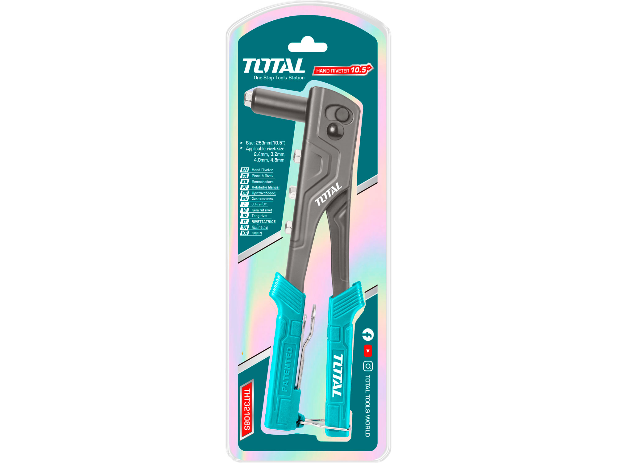 - Mit ihrer Länge von 270 mm bietet sie einen guten Hebelweg, um auch fester sitzende Nieten ohne großen Kraftaufwand zu entfernen. - Die Nietzange ist für verschiedene Nietgrößen geeignet, einschließlich 2,4 mm, 3,2 mm, 4 mm und 4,8 mm. - Sie verfügt über einen rutschfesten Griff für einen sicheren Halt während der Arbeit. - Die Zange ist ideal für Handwerker und Heimwerker, die regelmäßig mit Nieten arbeiten. - Sie ist leicht und kompakt, was sie ideal für den mobilen Einsatz macht. - Die Nietzange ist einfach zu bedienen und spart Zeit und Mühe im Vergleich zum manuellen Nieten. - Sie ist geeignet für eine Vielzahl von Materialien, einschließlich Metall, Kunststoff und Leder. - Mit der Nietzange von Total können Sie Ihre Nieten präzise und effizient setzen oder entfernen. Hersteller